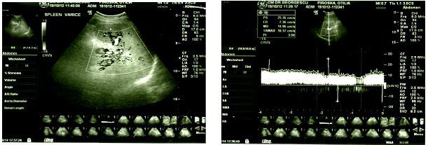 În figura de mai jos se remarcă dilatații ale VS în hilul splenic cu turbulențe în Doppler color și un aspect spectral de circulație portală cu scăderea IP al venei porte.
