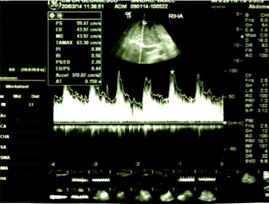 În figura alăturată, pacient cu creșterea IR = 0,56 la nivelul arterei hepatice în hil.